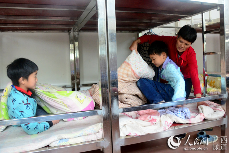 李水英(右一)為學(xué)生蓋被子。圖片來源:人民網(wǎng)廣西頻道