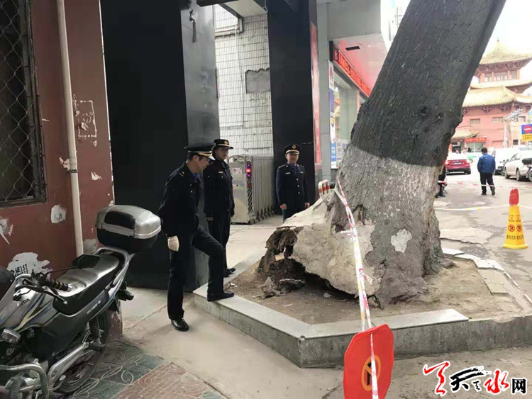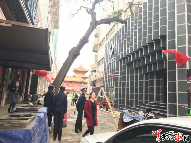 在整治過程中,大城中隊(duì)執(zhí)法人員發(fā)現(xiàn)民主西路奮斗巷內(nèi)的百年“古樹”嚴(yán)重受損。經(jīng)現(xiàn)場勘查,這顆百年“古樹”的根已外露,樹干并與地面約成60度夾角傾斜,隨時(shí)有發(fā)生倒落現(xiàn)象,存在安全隱患。對此情況,中隊(duì)執(zhí)法人員立即疏散過往行人,立警示牌,提醒過往行人和機(jī)動(dòng)車?yán)@道通行,避免了樹枝或樹干掉落砸傷行人,發(fā)生不良事故。