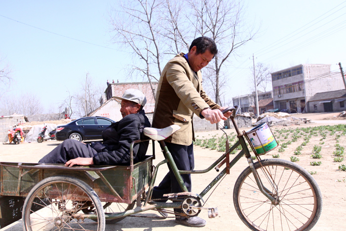 高成頂(右)用三輪車載著高文華老人出門。圖片來源:泗縣文明辦