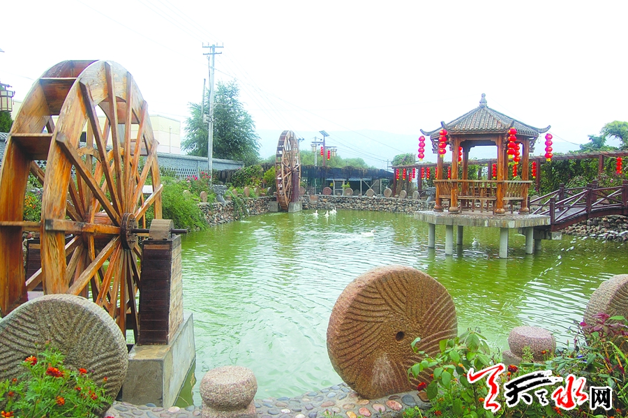 胡大村景色宜人的文化公園內(nèi),水車、磨盤與花草相映成趣。
