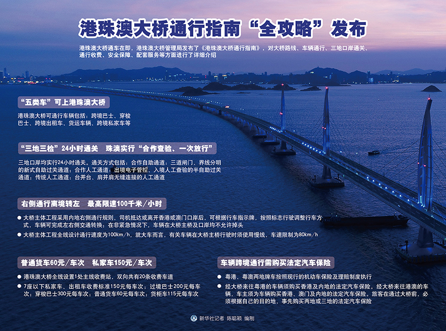 新華社廣州10月21日電(記者 周強(qiáng))港珠澳大橋通車(chē)在即,港珠澳大橋管理局發(fā)布了《港珠澳大橋通行指南》,對(duì)大橋路線、車(chē)輛通行、三地口岸通關(guān)、通行收費(fèi)、安全保障、配套服務(wù)等方面進(jìn)行了詳細(xì)介紹。