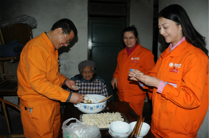 ????除了24小時(shí)待命處理用電問題外,王暢還帶著隊(duì)員們在空閑時(shí)候前往養(yǎng)老院、留守兒童學(xué)校等地進(jìn)行愛心幫扶。家住成都市都江堰市解放小區(qū)的代婆婆今年已經(jīng)87歲,雙目失明已有20多年,生活十分困難。得知情況后,王暢一有時(shí)間就往老人家里跑買菜、做飯、洗衣、陪著聊天……每逢節(jié)日,王暢便帶著隊(duì)員們?nèi)ヅ愦牌胚^節(jié);天氣冷了,又為代婆婆送去衣服用品。