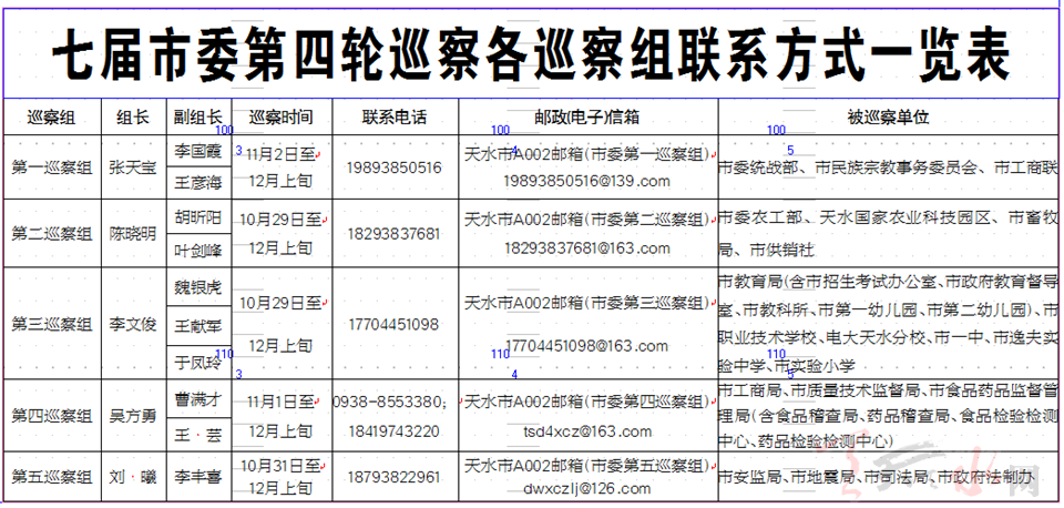 天天天水網(wǎng)訊【記者辛聞】根據(jù)市委統(tǒng)一安排部署,七屆市委第四輪巡察各巡察組進駐工作日前相繼完成。截至11月2日,市委5個巡察組分別進駐市委統(tǒng)戰(zhàn)部等20個市直單位開展巡察。