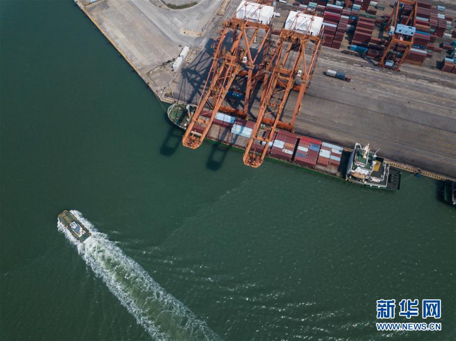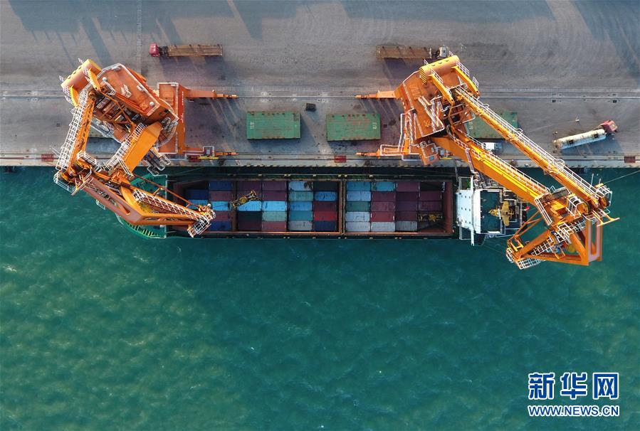 一艘海輪停泊在廣西欽州保稅港區(qū)碼頭裝運貨物(11月3日無人機拍攝)。新華社記者 張愛林 攝