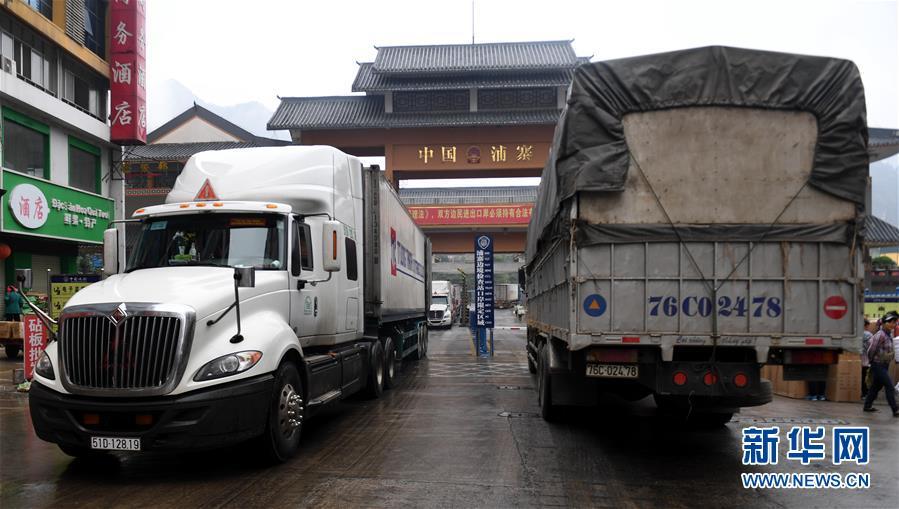 在廣西憑祥市浦寨邊貿區(qū),東盟國家的貨車進出運貨(1月16日攝)。新華社記者 張愛林 攝