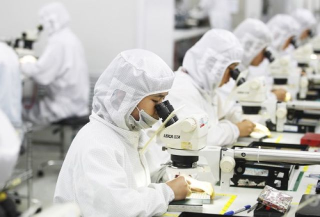 工作人員在烽火科技生產(chǎn)車間內(nèi)作業(yè)(2012年10月18日攝)。?新華社記者 肖藝九 攝