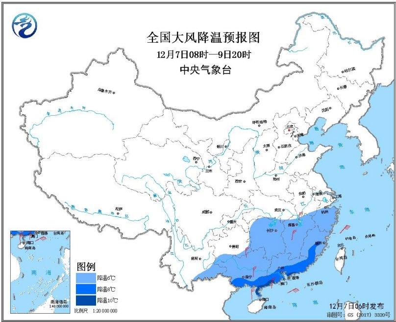受強(qiáng)冷空氣影響,中東部地區(qū)氣溫持續(xù)偏低,預(yù)計(jì)7日至9日,江南、華南、貴州南部等地的部分地區(qū)先后有4~5級(jí)偏北風(fēng),氣溫隨之下降6~8℃,其中,福建中南部、廣東南部及廣西南部等地的部分地區(qū)氣溫下降8~10℃。東部和南部海區(qū)先后有7~8級(jí)、陣風(fēng)9~10級(jí)大風(fēng)。9日早間最低氣溫0℃線將南壓至江南北部至貴州中部一帶。中央氣象臺(tái)12月7日06時(shí)繼續(xù)發(fā)布寒潮藍(lán)色預(yù)警。