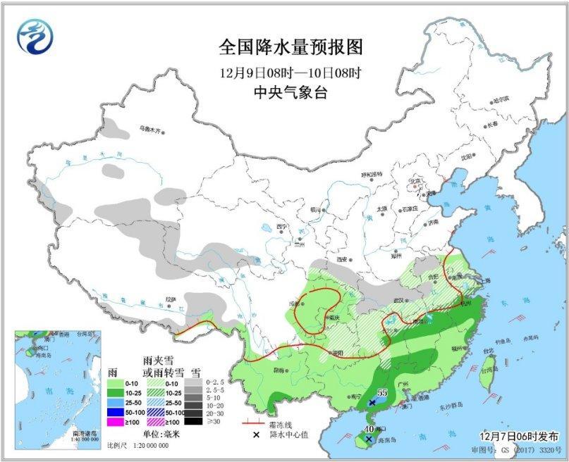 12月8日08時(shí)至9日08時(shí),西北地區(qū)東部、江漢、江淮、江南北部等地的部分地區(qū)有小到中雪或雨夾雪,其中,江淮南部、江南東北部等地的部分地區(qū)有大雪或暴雪(10~12毫米)。江南中東部和南部、華南中西部、云南中部、海南島、臺(tái)灣島等地的部分地區(qū)有中到大雨,其中,廣西東北部和臺(tái)灣島東部等地的局地有暴雨(50~60毫米)。北疆北部和安徽中部等地部分地區(qū)有4~6級(jí)及以上風(fēng)(見(jiàn)圖4)。東海、臺(tái)灣海峽將有7~8級(jí)、陣風(fēng)9級(jí)的東北風(fēng)。