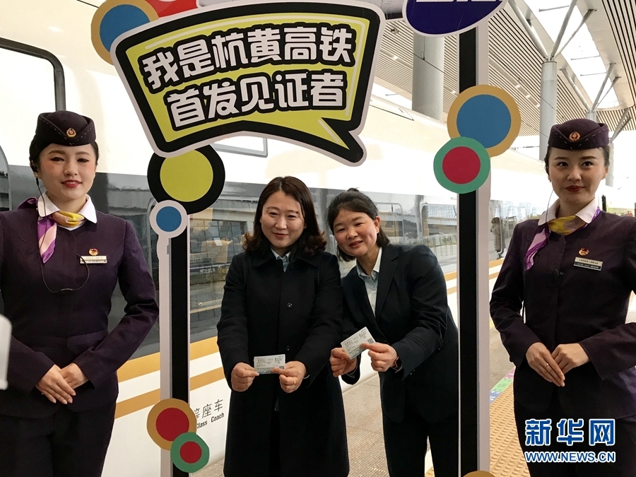 12月25日上午8點(diǎn)34分,從杭州發(fā)往黃山的首發(fā)車D9551發(fā)出,旅客拍照留念。新華網(wǎng) 韓家慧 攝
