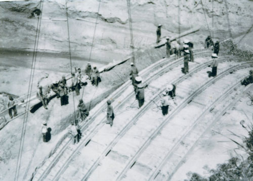 圖為施工人員用自制的索吊起吊第一片拱肋的現(xiàn)場(chǎng)