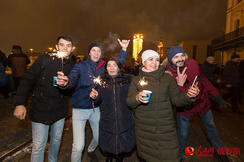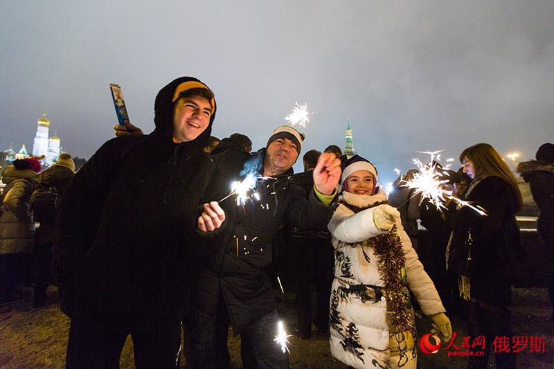 人民網(wǎng)莫斯科1月1日電(記者 屈海齊)隨著新年鐘聲的響起,五彩繽紛的煙火在空中綻放。街邊的俄羅斯民眾齊聲歡呼、相互祝福。