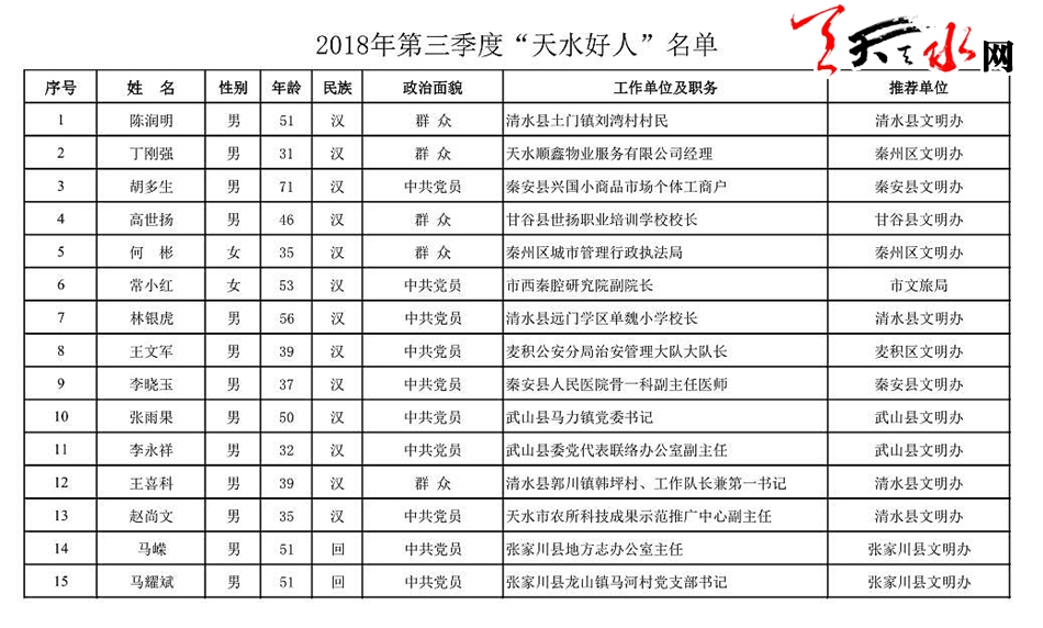 天天天水網(wǎng)訊 日前,2018年第三季度“天水好人”名單正式出爐,陳潤明、丁剛強、胡多生等15人榜上有名。