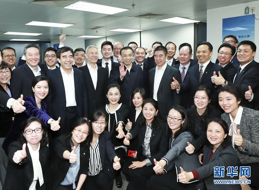 1月4日,中共中央政治局常委、國(guó)務(wù)院總理李克強(qiáng)到中國(guó)銀行、中國(guó)工商銀行、中國(guó)建設(shè)銀行考察,并在銀保監(jiān)會(huì)主持召開(kāi)座談會(huì)。這是李克強(qiáng)在中國(guó)建設(shè)銀行普惠金融事業(yè)部考察后與員工合影。新華社記者 龐興雷 攝