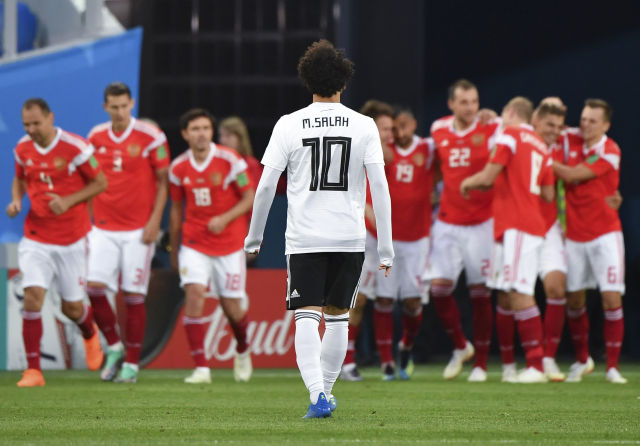 ????↑2018年6月19日,埃及隊(duì)球員薩拉赫在比賽中注視俄羅斯隊(duì)球員慶祝進(jìn)球。當(dāng)日,在圣彼得堡進(jìn)行的2018俄羅斯世界杯足球賽A組小組賽中,俄羅斯隊(duì)以3比1戰(zhàn)勝埃及隊(duì),取得兩連勝。 新華社記者李尕?cái)z