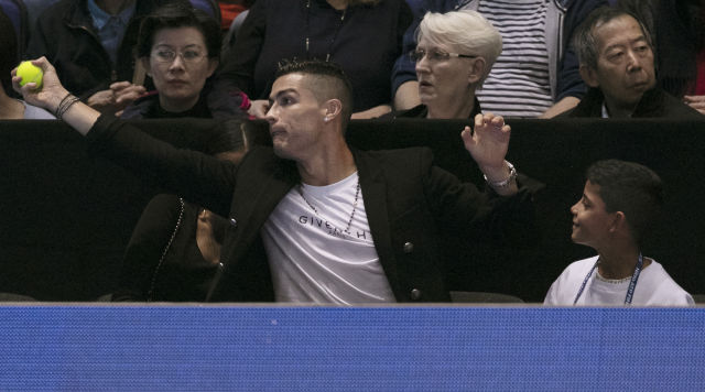 ????↑2018年11月12日,葡萄牙球星克·羅納爾多(中)在場邊抓住球員熱身時(shí)飛出場的網(wǎng)球。當(dāng)日,在英國倫敦進(jìn)行的2018ATP世界巡回賽年終總決賽單打小組賽中,塞爾維亞選手焦科維奇以2比0戰(zhàn)勝美國選手伊斯內(nèi)爾。 新華社記者韓巖