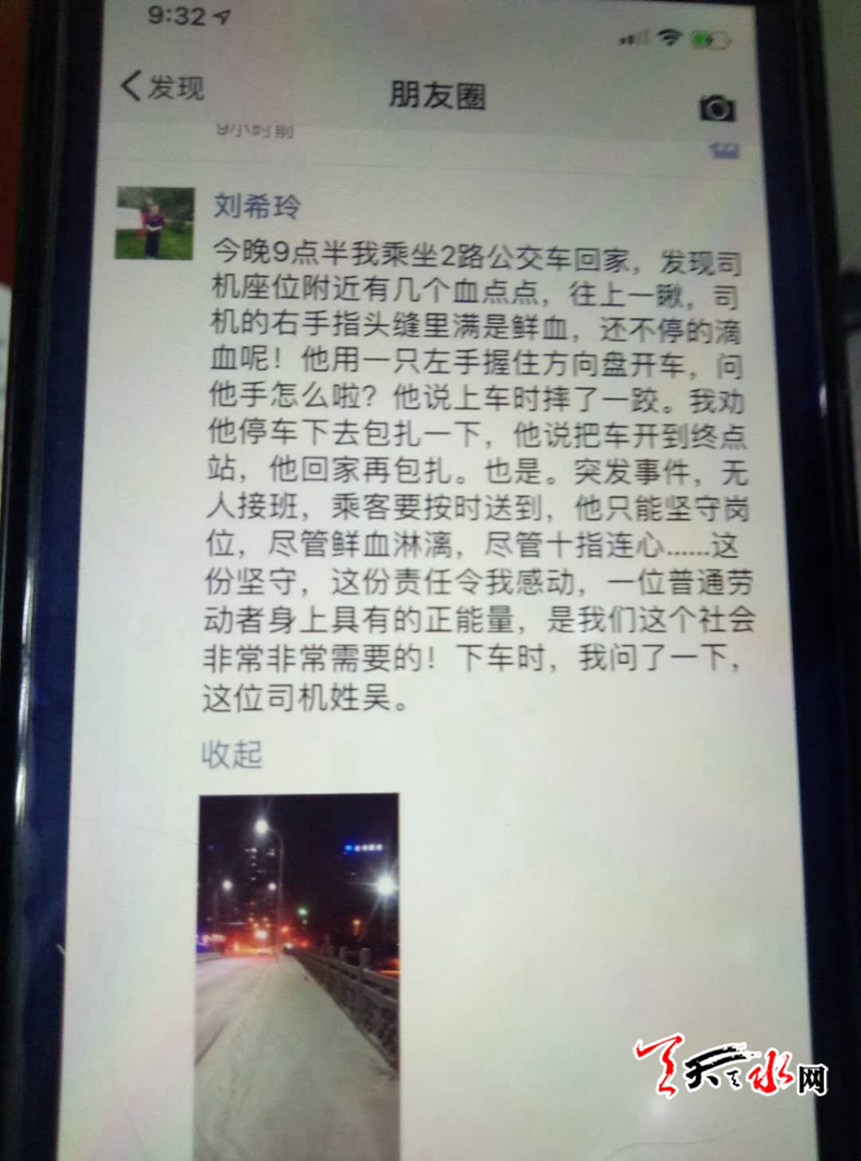 ????近日,經(jīng)記者多方尋找,聯(lián)系到了當(dāng)日乘坐2路公交車,目擊暖心一幕的乘客退休教師劉希玲,據(jù)劉老師回憶,那日她乘坐的2路公交車上的駕駛員師傅給她留下了印象深刻。2018年12月27日晚上9點30左右,劉老師乘坐2路公交車回家,一上車就看到了駕駛員師傅的手在滴血,劉老師便就主動上前詢問情況。駕駛員師傅說下雪天,天也黑了,上車時不小心摔了一跤手破了,劉老師便說要不找個地方先把手包扎下吧,還滴著血呢。駕駛員師傅卻要堅持把一車人送到站再去包扎。在車靠站的間隙劉老師上前遞了張紙巾給司機師傅,下車時劉老師就問了下司機師傅的姓名,司機師傅告訴劉老師說他姓吳便不再多說什么了,劉老師也到站下車了。回家后劉老師發(fā)現(xiàn)自己手上也有干涸的血跡,便就當(dāng)晚發(fā)生在2路公交車上的事發(fā)了條朋友圈,劉女士發(fā)在朋友圈的文字中感慨寒冷的風(fēng)雪夜,一名普通公交車司機帶來的溫暖。從事數(shù)十年的劉老師就將這件事發(fā)到了朋友圈,得到了很多學(xué)生及家長的點贊評論,并讓劉老師把吳師傅的事跡反映到公交車公司和媒體。劉老師說,之所以想向媒體反映這件事是因駕駛員吳師傅的這份堅守,這份責(zé)任令她感動,一位普通勞動者身上具有的正能量,是我們這個社會非常非常需要的。
