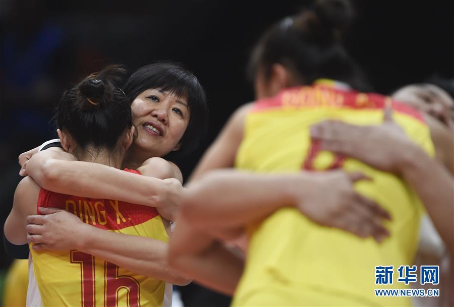 2016年8月20日,中國(guó)隊(duì)主教練郎平(左二)在2016年里約奧運(yùn)會(huì)女子排球決賽戰(zhàn)勝塞爾維亞隊(duì)奪冠后與隊(duì)員擁抱慶祝。新華社記者李尕?cái)z