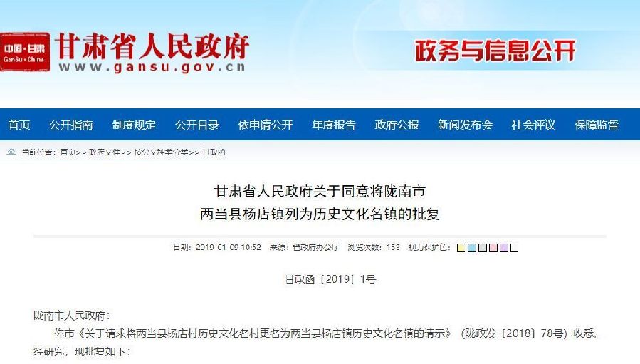 你市《關(guān)于請(qǐng)求將兩當(dāng)縣楊店村歷史文化名村更名為兩當(dāng)縣楊店鎮(zhèn)歷史文化名鎮(zhèn)的請(qǐng)示》(隴政發(fā)〔2018〕78號(hào))收悉。經(jīng)研究,現(xiàn)批復(fù)如下: