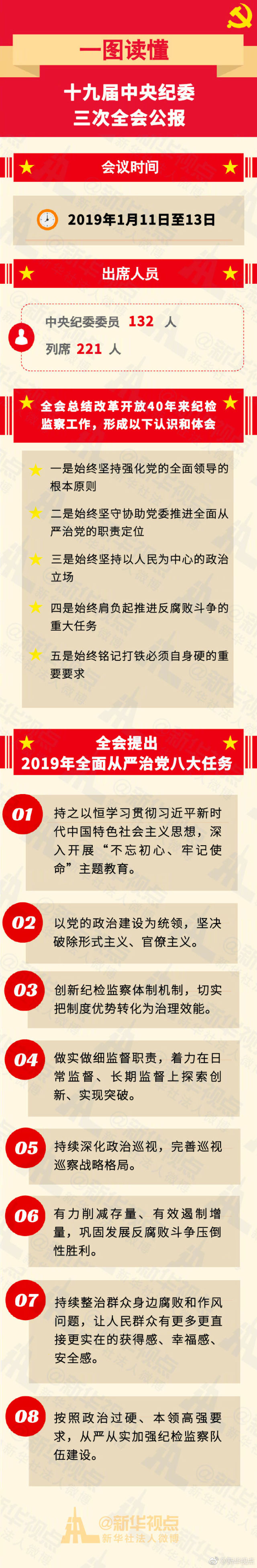【一圖讀懂十九屆中央紀(jì)委三次全會公報】為期3天的十九屆中央紀(jì)委三次全會今天在北京閉幕。新華社受權(quán)發(fā)布了全會公報。此次中央紀(jì)委全會取得了哪些重要成果?對2019年全面從嚴(yán)治黨、黨風(fēng)廉政建設(shè)和反腐敗斗爭又有哪些新的部署?詳情戳圖