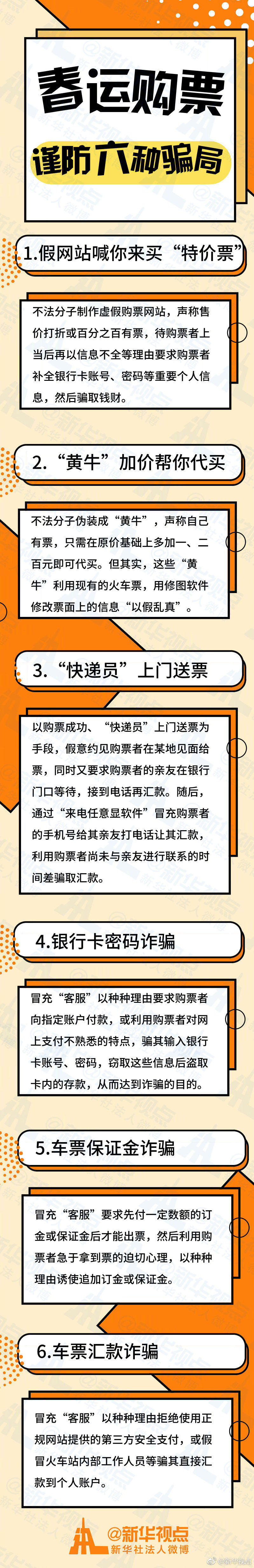 2019年春運(yùn)即將到來(lái),不少旅客正在通過(guò)電話或網(wǎng)絡(luò)搶購(gòu)車(chē)票,而一些不法分子也趁機(jī)謀劃種種購(gòu)票騙局,騙取旅客錢(qián)財(cái)。戳圖,謹(jǐn)防這六種騙局?