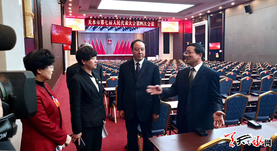 ????天天天水網(wǎng)訊【記者 張文都】1月14日下午,在天水市第七屆人民代表大會第四次會議即將開幕之際,市人大常委會黨組副書記、副主任蒲朝暉到會議主會場天水賓館,實地檢查會場布置、安保等情況。市人大常委會秘書長楊坤一同檢查。