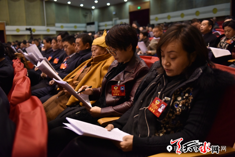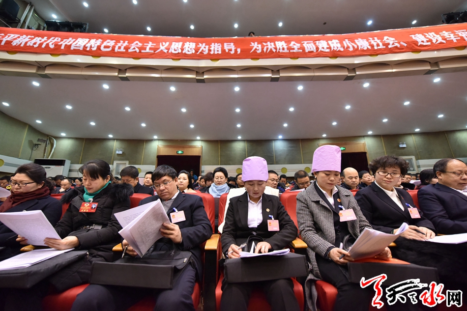 當(dāng)天的秦州劇院氣氛喜慶莊嚴(yán),主席臺帷幕中央國徽高懸,十面紅旗分列兩側(cè)。300多名人大代表肩負(fù)全市人民的重托出席大會,認(rèn)真履行憲法和法律賦予的神圣職責(zé)。