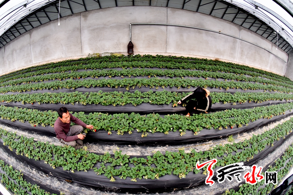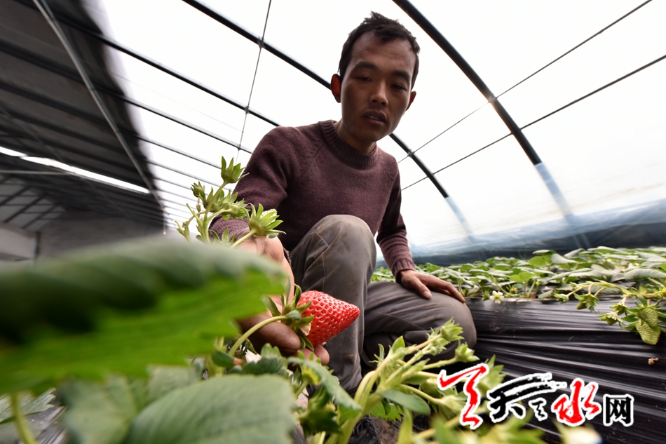 ????1月20日,記者在孫集村見到了正在大棚里察看草莓長勢的駱同輝?!疤焖葺袌鰞r格高,草莓品質(zhì)也好,這里種植草莓前景好?!币言谡憬惺嗄瓴葺N植經(jīng)驗的駱同輝,在談到有關(guān)草莓的事時表現(xiàn)出的自信溢于言表。今年35歲的駱同輝,個子雖不高,但言談舉止中透著南方人的精明,記者了解到他之前就在浙江從事草莓種植,與草莓“交往”的十余年里積攢了較為豐富的種植經(jīng)驗和管理方法。去年他在麥積區(qū)渭南鎮(zhèn)從事草莓種植的同鄉(xiāng)那里了解行情后,7月份來天水開始了自己的創(chuàng)業(yè)夢想。