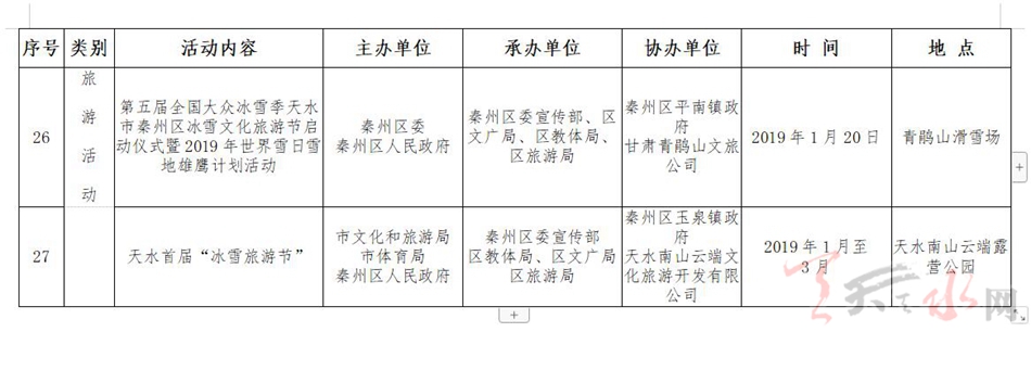 旅游活動類4項,包括秦州區(qū)第二屆“生態(tài)南山杯”萬人徒步健身登山活動,今日頭條“人文天水DOU起來”抖音挑戰(zhàn)賽,全國第五屆大眾冰雪季天水市秦州區(qū)冰雪文化旅游節(jié)啟動儀式暨2019年世界雪日雪地雄鷹計劃,天水首屆“冰雪旅游節(jié)”活動。