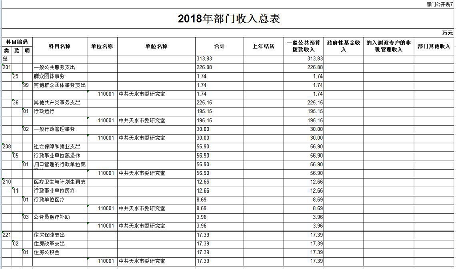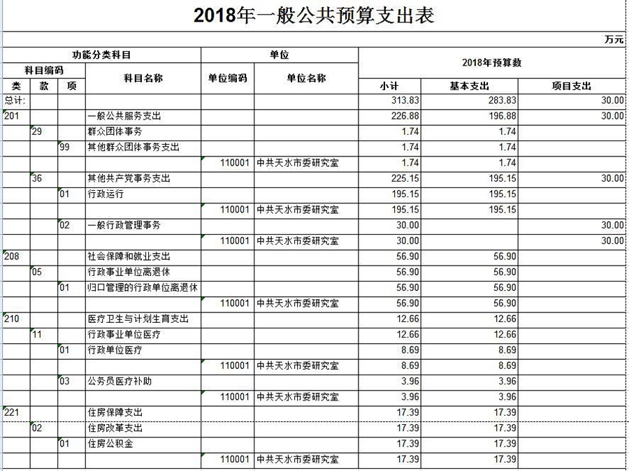2018年市委研究室預算收入313.83萬元,其中:一般公共預算財政撥款收入313.83萬元,預算支出313.83萬元。