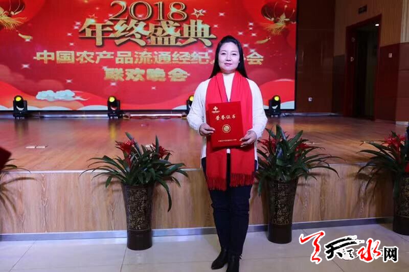 天天天水網訊【記者閆蓉芳】 日前,記者從市婦聯(lián)了解到,在近日召開的中國農產品流通經紀人協(xié)會二屆七次理事會暨2018年年會上,舉行了“百企百品百人”工程建設活動授牌儀式,我市女企業(yè)家王文萍當選為中國農產品流通經紀人協(xié)會常務理事,并獲評“中國農產品行業(yè)領軍人物”。