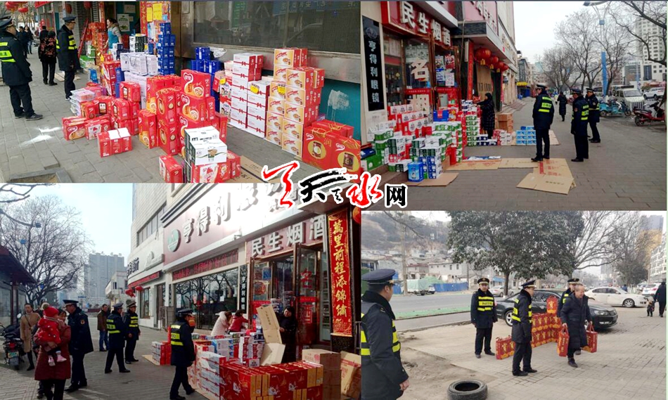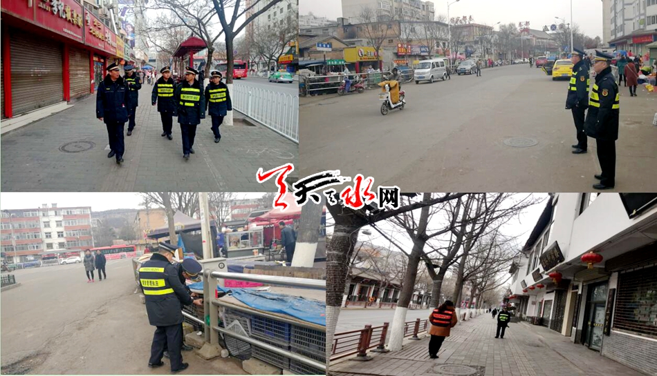 ????天天天水網訊 大年初一的秦州到處張燈結彩、喜氣洋洋,在這舉國歡慶、萬家團圓的時刻,秦州區(qū)執(zhí)法局依然堅守崗位,護航佳節(jié),加大巡查力度,堅持管理一線不放松,對龍城廣場、天河廣場、伏羲廟、玉泉觀、南郭寺、建設路、民主路、大眾路等重點區(qū)域的水果墻、禮品堆和店外經營、亂停亂放以及違規(guī)燃放違規(guī)煙花等行為進行集中巡查整治……