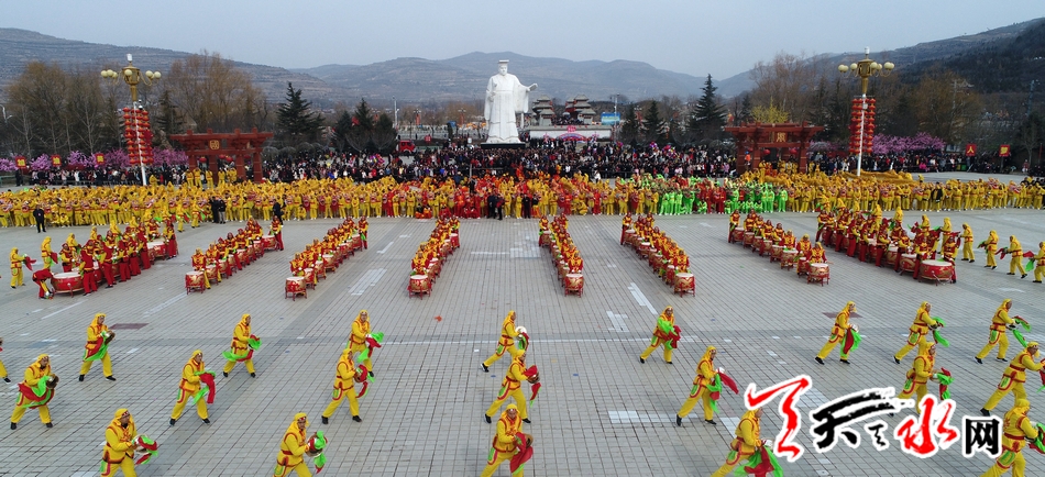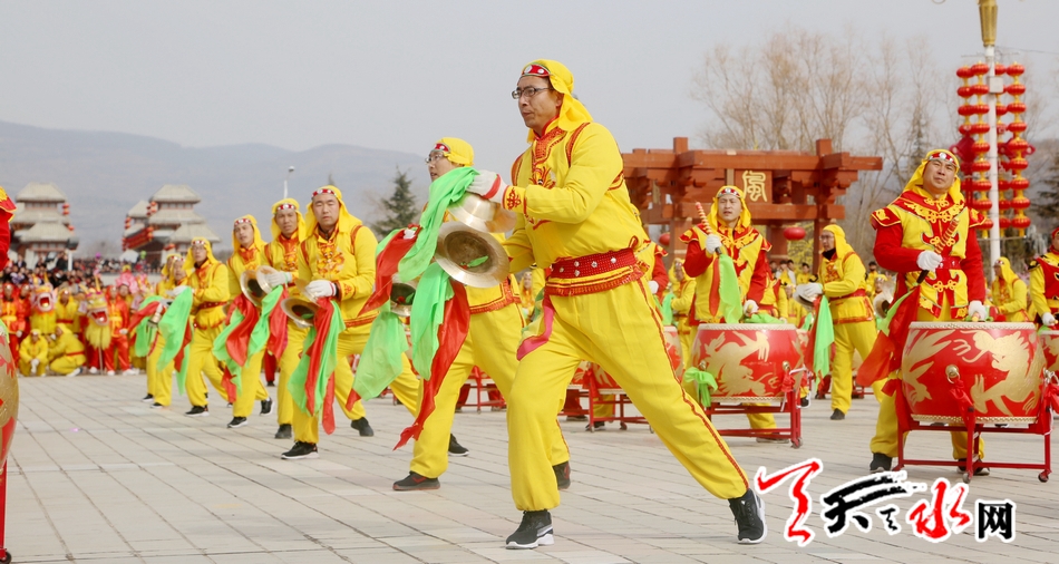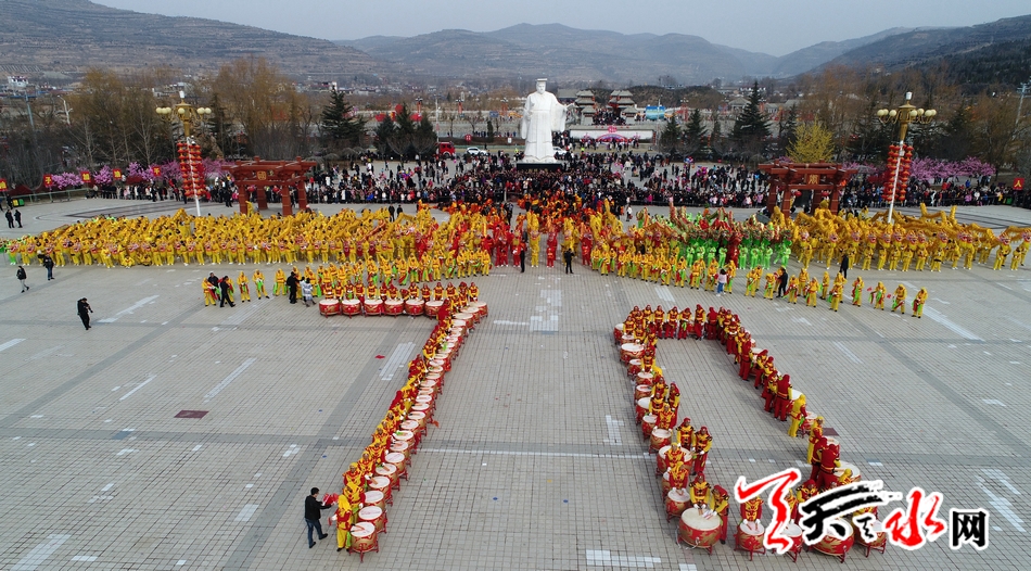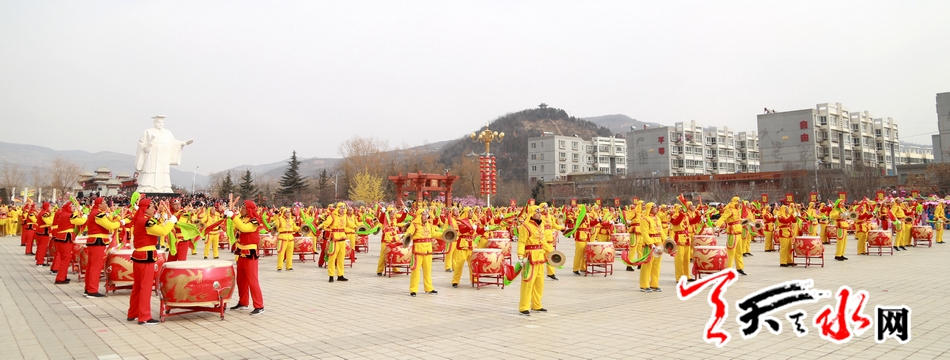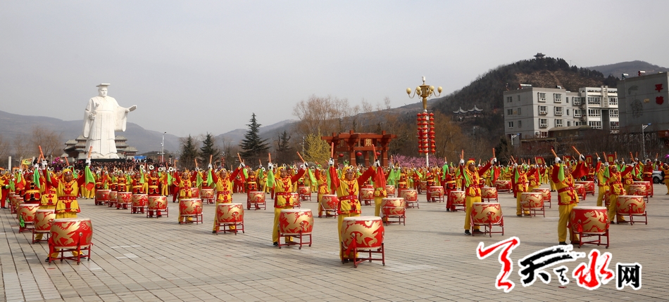 ????鼓振雄風(fēng)表演有160多人參加,以70面鼓、70面鈸為主要元素,為新中國成立70周年獻(xiàn)禮,其中大鼓24面,寓意24節(jié)氣,祈福中華大地風(fēng)調(diào)雨順、國泰民安。鼓振雄風(fēng)表演將清水軒轅鼓之豪邁奔放和傳統(tǒng)鼓法之簡潔明快巧妙融為一體,時(shí)而鼓聲雷動(dòng),浩浩湯湯,恰如萬馬奮蹄、銀河直瀉;時(shí)而金鈸激揚(yáng),鏗鏘連連,猶如驟雨急降、驚濤襲面;時(shí)而鼓鈸齊震,裂云嘯日,恍若四海激昂、五洲奮進(jìn)。酣暢的鼓點(diǎn)、恢弘的氣勢和鏗鏘的節(jié)奏,打出了清水人民淳樸誠信、尚德務(wù)實(shí)的個(gè)性和品質(zhì),奏出了清水人民決戰(zhàn)脫貧、決勝小康一往無前、創(chuàng)新超越的傲骨和精神。