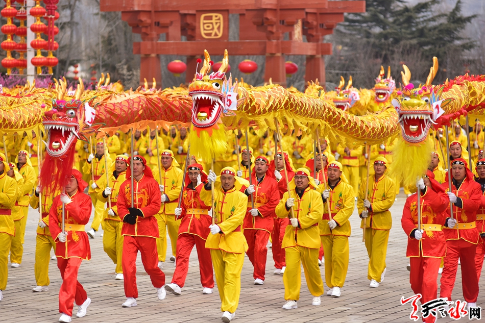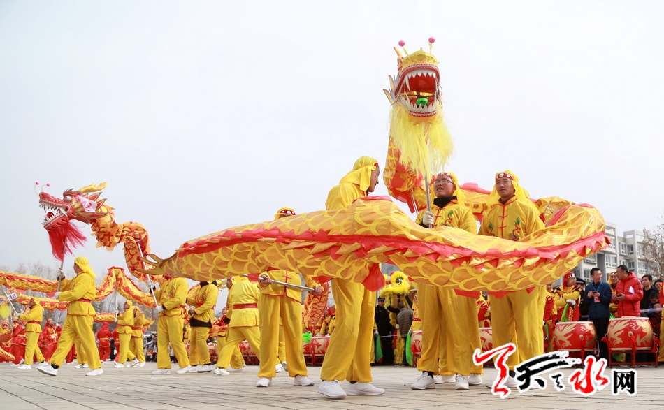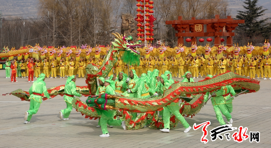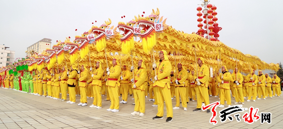????在歡快的鼓聲中,龍騰盛世表演在整齊的鼓聲中奔騰而出,舞龍表演共分為祥龍出宮、飛龍起舞、金龍團(tuán)圓等幾個(gè)片斷。伴隨著新春喜慶的鑼鼓,縣直六大口40多個(gè)單位700多位干部職工揮舞著70條巨龍,時(shí)而上下穿梭、時(shí)下騰空而起,時(shí)而你追我趕,如同大海搏浪,如同騰云駕霧,如同蛟龍出海,集中展示了清水兒女意氣風(fēng)發(fā)、乘勢而上的時(shí)代精神。70條彩龍?jiān)⒁鉃樾轮袊闪?0周年獻(xiàn)禮,其中56條大龍象征56個(gè)民族,14條小龍象征著祖國的輝煌與發(fā)展,寓意在新的一年里民族團(tuán)結(jié),和和美美,欣欣向榮。