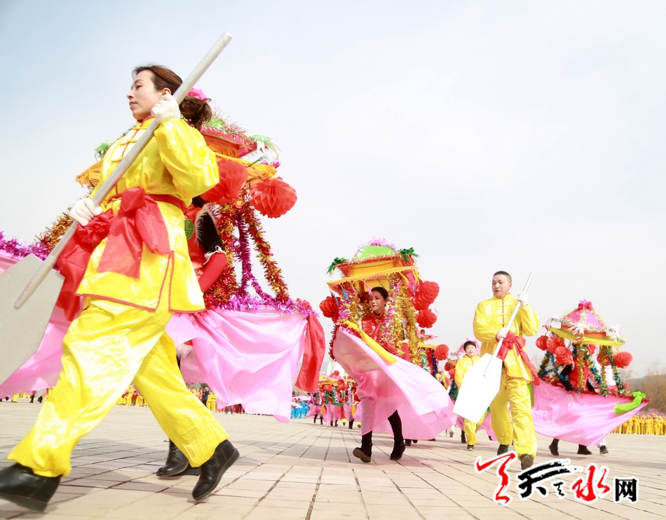 ????行穩(wěn)致遠(yuǎn)篇章由70個(gè)艄公和70支早船組成,70支旱船如千帆競發(fā),如百舸爭流,展現(xiàn)了清水兒女在市場經(jīng)濟(jì)大潮中搏浪前進(jìn)、力爭上游、不甘人后的精神風(fēng)貌。