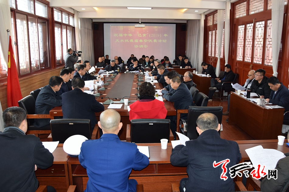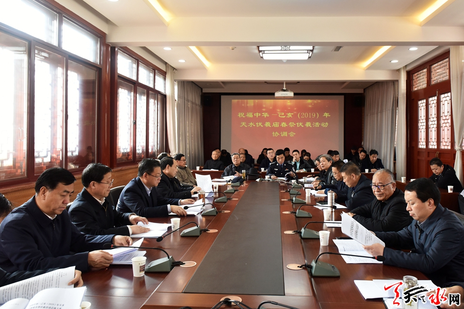 天天天水網(wǎng)訊【全媒體記者馬哲】2月13日,己亥(2019)年伏羲廟春祭伏羲活動(dòng)協(xié)調(diào)會(huì)在伏羲廟召開,市領(lǐng)導(dǎo)張建杰、安志宏、蒲朝暉、逯克宗、蘇定武出席會(huì)議,市直相關(guān)部門及秦州區(qū)政府相關(guān)負(fù)責(zé)人參加會(huì)議。
