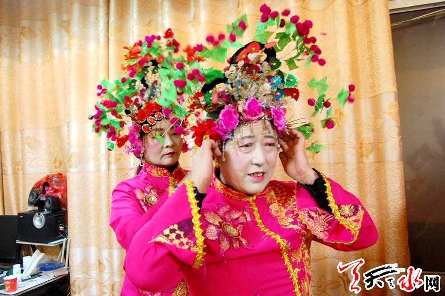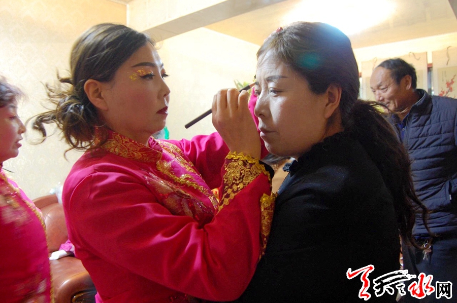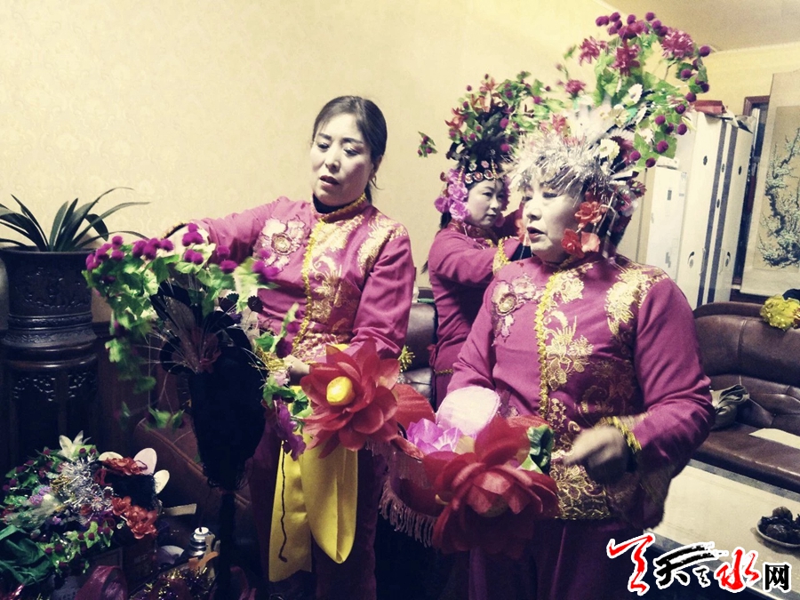 此刻,在團長范小紅家,一場表演前的準備工作正在有序進行……對鏡梳妝、佩戴頭飾、穿著服裝、整理道具,隨著陸續(xù)而來的社火隊員,已成為“化妝間”的寬敞客廳頓時顯得擁擠起來。