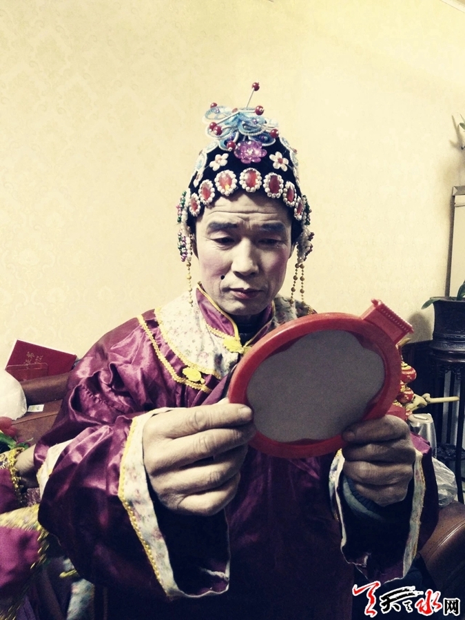 媽媽化妝時,10歲的張麗婷始終圍著打轉(zhuǎn),提著袋子當起小跟班。因是第一次參與媽媽的社火表演,讓她興奮不已,一個勁地對著媽媽樂呵呵地傻笑,嘴里還不忘給別人夸贊,“我媽打扮起來心疼著呢!”