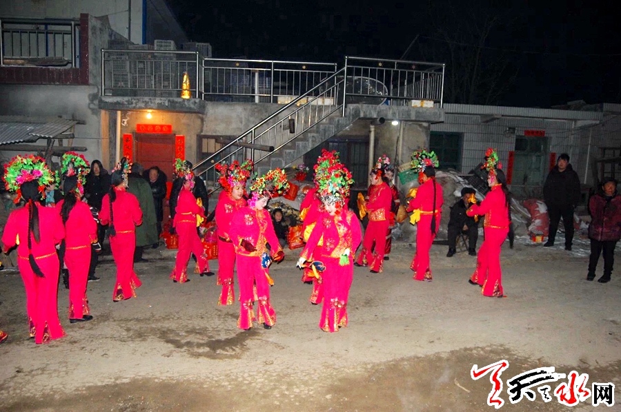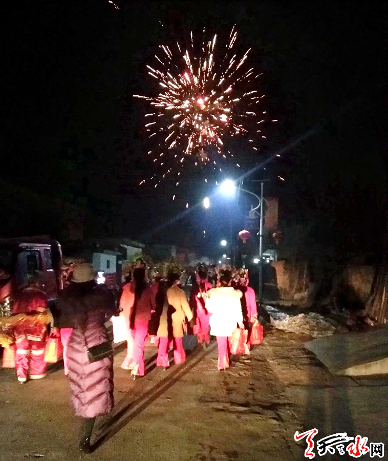 說話間,天已漸黑,門外響起的鑼鼓聲讓原本平靜的村莊開始熱鬧起來,村民扶老攜幼聞聲趕來,已收拾停當?shù)纳缁痍爢T們紛紛走出屋外。伴著天空不時綻放的煙花,踏著尚未消融的積雪,沒走多久,浩浩蕩蕩的社火隊便在一戶何姓人家門前停了下來。