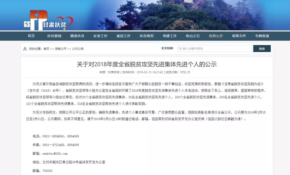 為充分發(fā)揚民主,按照公開公平公正的原則,確保先進集體、先進個人事跡真實可靠,廣泛接受群眾監(jiān)督,現(xiàn)就擬表彰名單進行全省公示,公示期為2019年2月15日至2月21日。公示期間,如有不同意見,請于2019年2月21日18時前通過電話、郵箱、信函等形式向省扶貧開發(fā)辦公室反映(信函以到達日郵戳為準)。