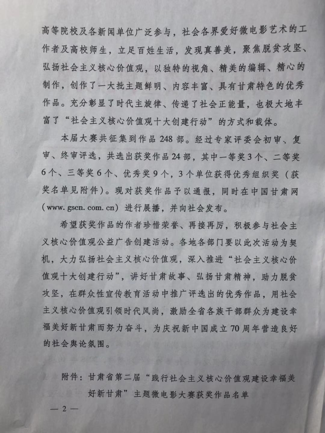 甘肅省第二屆“踐行社會主義核心價值觀建設幸福美好新甘肅”主題微電影獲獎作品名單