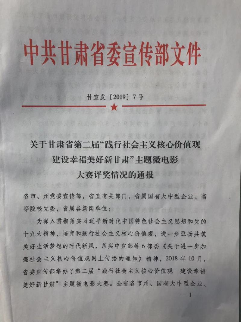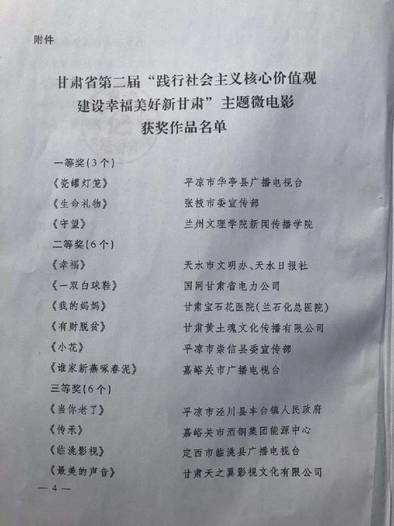 天天天水網(wǎng)訊【記者 何永德】2月21日,甘肅省委宣傳部舉辦的第二屆“踐行社會(huì)主義核心價(jià)值觀 建設(shè)幸福美好新甘肅”主題微電影大賽評(píng)選揭曉,由市文明辦出品,天水日?qǐng)?bào)社、清水縣委宣傳部、清水縣文明辦聯(lián)合攝制的微電影《幸?!吩?40多部作品中脫穎而出,榮獲二等獎(jiǎng)。