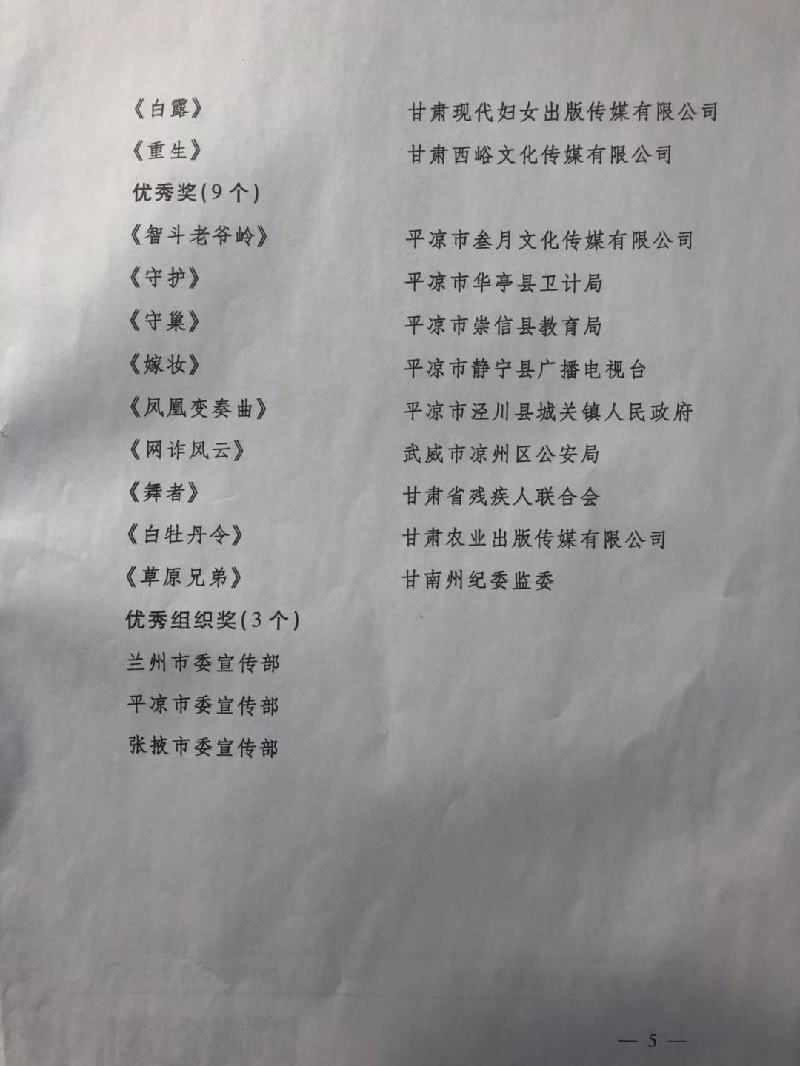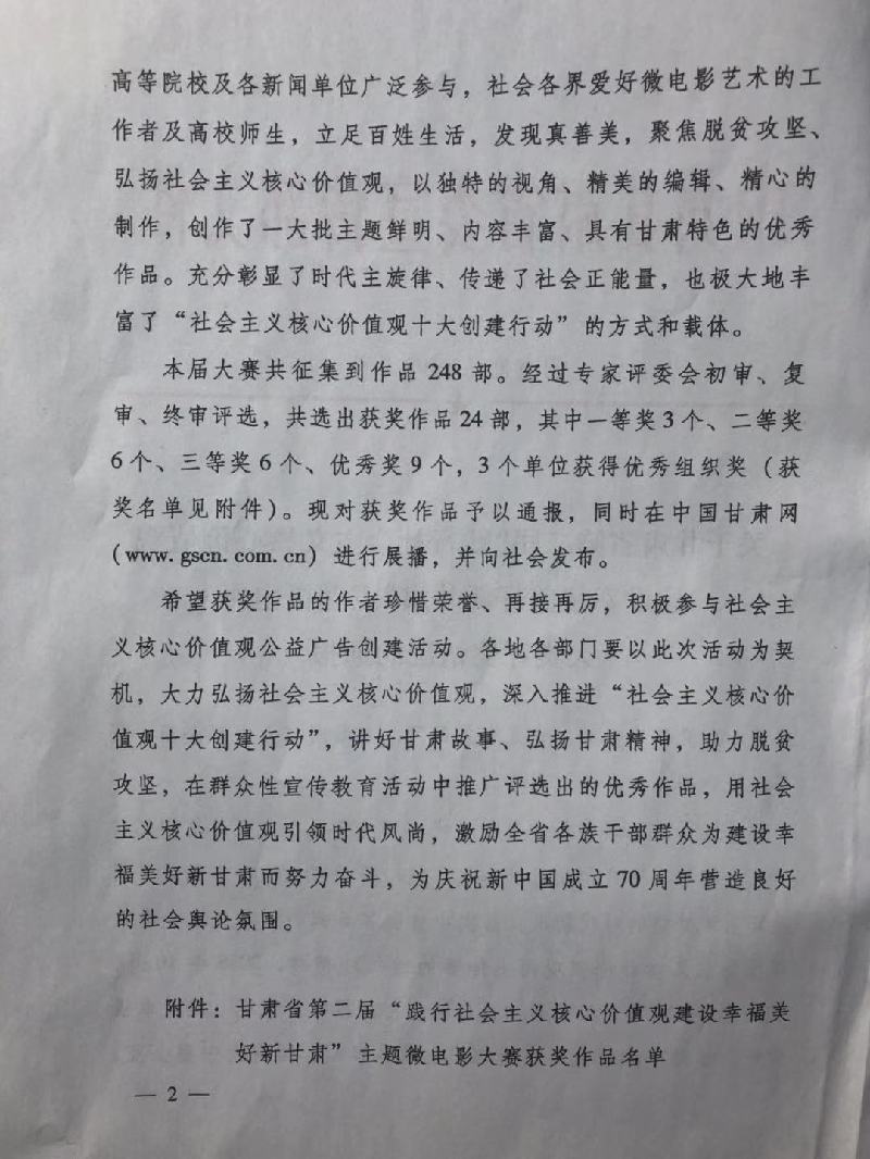 第二屆“踐行社會(huì)主義核心價(jià)值觀 建設(shè)幸福美好新甘肅”主題微電影大賽自去年10月征集以來,共征集到來自全省各市州、國(guó)有大中型企業(yè)、高等院校及各新聞單位作品248部。經(jīng)過專家評(píng)委會(huì)初審、復(fù)審、終審評(píng)選,共選出獲獎(jiǎng)作品24部,其中一等獎(jiǎng)3個(gè)、二等獎(jiǎng)6個(gè)、三等獎(jiǎng)6個(gè)、優(yōu)秀獎(jiǎng)9個(gè),3個(gè)單位獲得優(yōu)秀組織獎(jiǎng)。