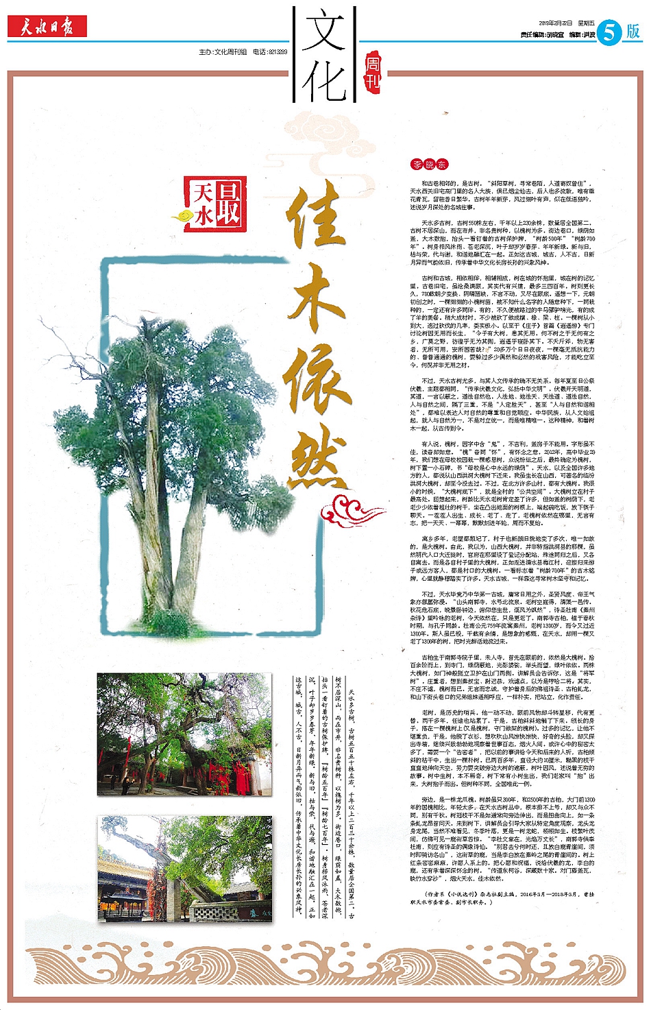 天水多古樹,古樹550株左右,千年以上230余株,數(shù)量居全國第二。古樹不居深山,而在市井,非名貴樹種,以槐樹為多。街邊巷口,綠蔭如蓋,大木數(shù)抱,抬頭一看釘著的古樹保護(hù)牌,“樹齡500年”“樹齡700年”。樹身櫛風(fēng)沐雨、蒼老深沉,葉子卻歲歲春芽、年年新綠。新與舊,枯與榮,代與謝,和諧地融匯在一起。正如這古城,城古,人不古,日新月異而氣韻依舊,傳承著中華文化長房長孫的興象風(fēng)神。