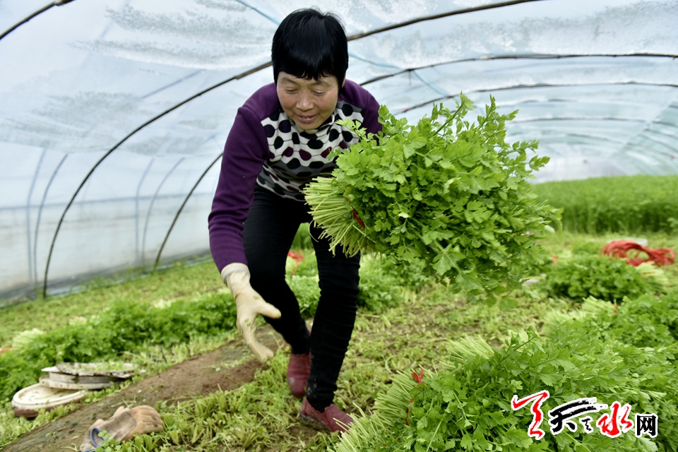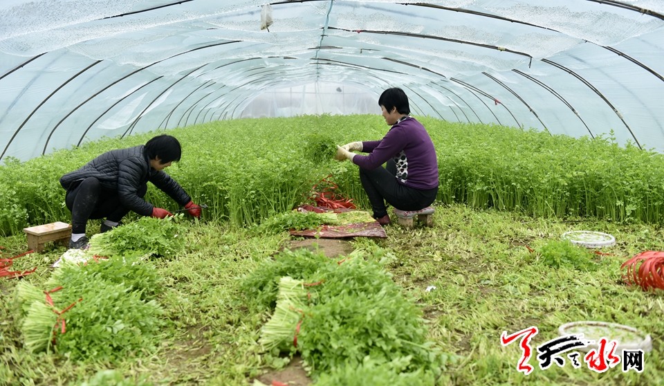 中午時分,記者來到了王隨應(yīng)家的芹菜大棚,一進大棚濕熱的空氣撲面而來,走在濕熱的大棚里,不一會兒,記者便不自覺的摘下了圍巾。遍地新鮮嫩綠的毛芹菜茂密繁盛。王隨應(yīng)正忙著收割芹菜,初春的季節(jié)里他額頭冒著汗珠,當(dāng)問到他怎么還不回家吃飯時,他笑呵呵地對記者說:“飯還顧上吃!現(xiàn)在割的芹菜都是客商定好的,今天必需把棚里的芹菜割完?!毕袼疫@樣的一個芹菜大棚,這個季節(jié)大概50多天割一茬,一茬能產(chǎn)800多公斤,一年七到八茬,現(xiàn)在收割的這一茬一個大棚的芹菜大概能賣4000元左右。