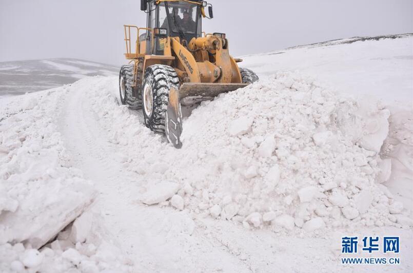 2月23日,在青海省玉樹藏族自治州稱多縣扎朵鎮(zhèn)治多村,一輛裝載機在清除路面積雪。新華社記者吳剛攝