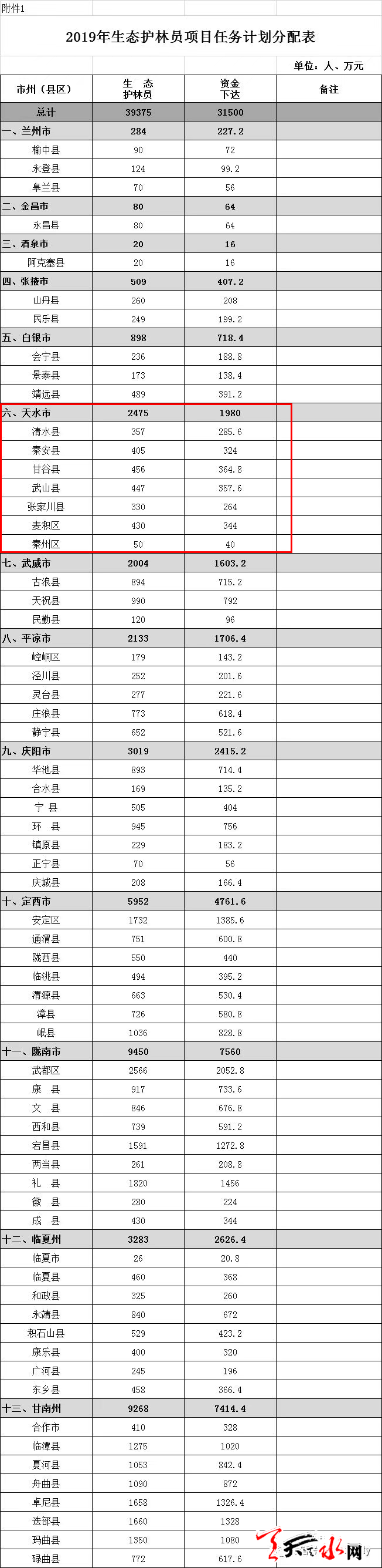 天天天水網(wǎng)訊據(jù)每日甘肅網(wǎng)消息 日前,甘肅省林業(yè)和草原局下達(dá)2019年生態(tài)護(hù)林員項(xiàng)目任務(wù)計(jì)劃的通知,根據(jù)計(jì)劃,今年全省將聘用39375名生態(tài)護(hù)林員,其中天水2475名。每個(gè)護(hù)林員年補(bǔ)助8000元,目前,該項(xiàng)目資金已下達(dá)。