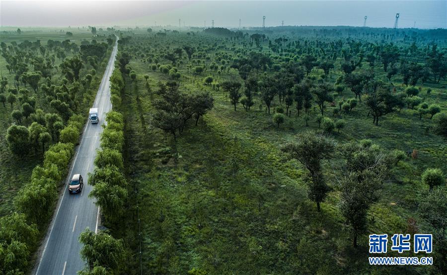 汽車行駛在陜西榆林市靖邊縣東坑鎮(zhèn)新建村的道路上(2018年8月1日無人機拍攝)。陜西省開展的天然林保護工程和全面治理荒沙行動,極大改善了毛烏素的生態(tài)環(huán)境,也使沙漠南緣的陜西省榆林市實現(xiàn)從“沙進人退”到“綠進沙退”的轉變。 新華社記者 陶明 攝
