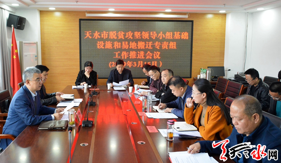 ????天天天水網(wǎng)訊【全媒體記者馬放】3月15日,天水市委常委、常務(wù)副市長趙四輩主持召開全市脫貧攻堅領(lǐng)導(dǎo)小組基礎(chǔ)設(shè)施和易地搬遷專責(zé)工作組推進(jìn)會。會議聽取了專責(zé)小組成員單位就全市脫貧攻堅領(lǐng)域基礎(chǔ)設(shè)施和易地搬遷工作進(jìn)展情況的匯報,深入分析了目前工作中存在的困難和問題,對進(jìn)一步加快基礎(chǔ)設(shè)施和易地搬遷工作進(jìn)度作出安排部署。