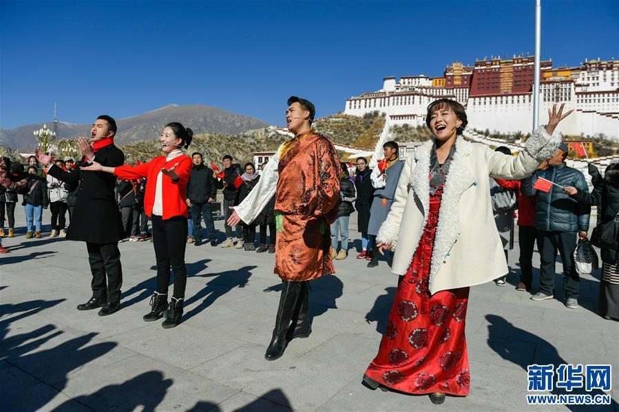 2018年12月31日,演員在布達(dá)拉宮廣場的快閃活動(dòng)中演唱《我和我的祖國》。 新華社記者 劉東君攝