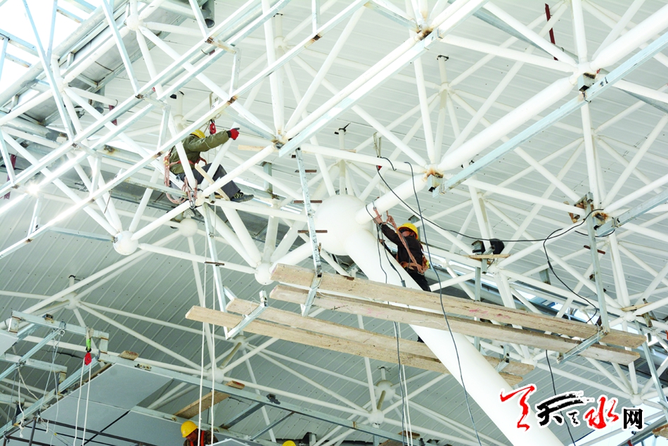 隨著工作面的逐步展開(kāi),各參建單位組織的施工班組不斷增加,目前已經(jīng)達(dá)到700人。施工現(xiàn)場(chǎng),各工種交叉作業(yè),內(nèi)外裝、機(jī)電、消防、綠化多個(gè)作業(yè)面同步展開(kāi),現(xiàn)場(chǎng)氣氛緊張而繁忙——夜晚,體育館燈火通明?!叭鞊屢惶?,一周干九天”,項(xiàng)目現(xiàn)場(chǎng)負(fù)責(zé)在介紹進(jìn)度推進(jìn)時(shí)如是說(shuō)。